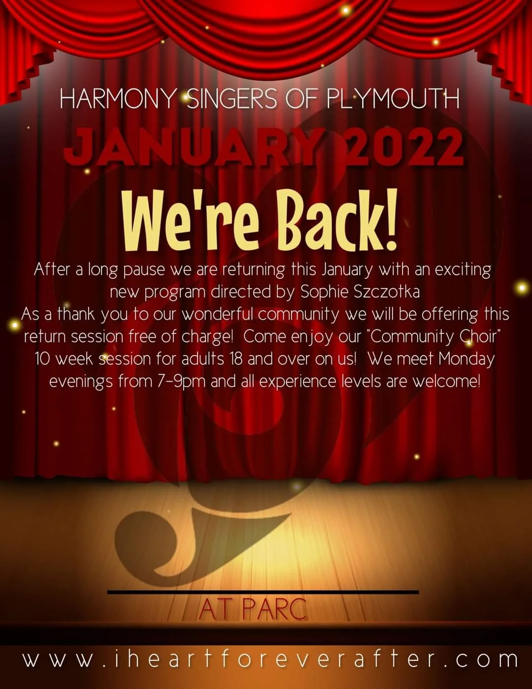 Harmony Singers, our adult singing group, Fall season begins September 22nd 2025. Harmony Singers meets Mondays in room #102 at PARC 7pm - 9pm. Join us!